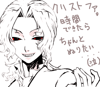 てゆうかカウンタがこの連休で1900台まで回ってます………どうしよう……2000のキリ番とるべきかな。でもこの辺境ブログサイトでリクしてくださる希少な方がいらっしゃるかどうか…自分でバカノ年代キリ番絵でも好き勝手に書こうかなあとも思ってます。何枚描く気だ!!